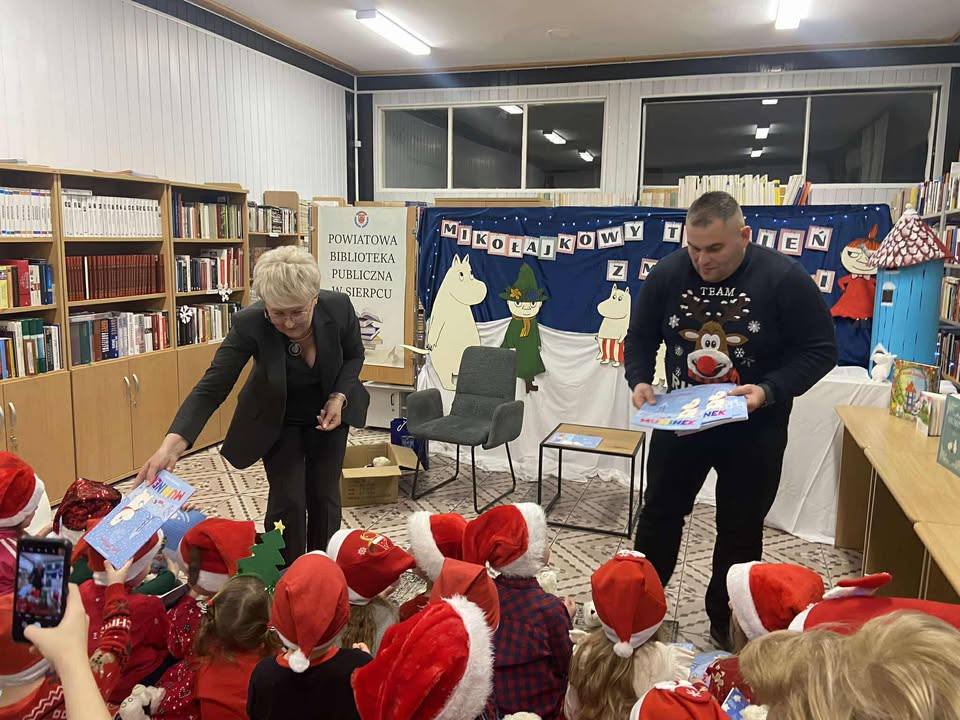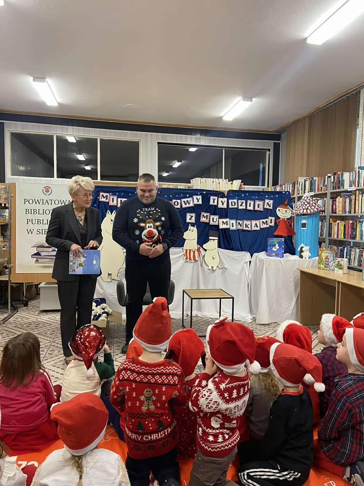 Wyjątkowym momentem była wizyta Starosty Sierpeckiego Przemysława Burzyńskiego, który wcielił się w postać Rudolfa i przeczytał przedszkolakom piękną opowieść o Muminkach. Spotkanie było okazją do rozmów o wartości przyjaźni – zarówno tej znanej z książek, jak i tej budowanej każdego dnia przez dzieci. Na zakończenie każdy mały uczestnik otrzymał mikołajkowy upominek, co wywołało wiele radości i uśmiechów.